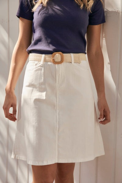 Take your denim wardrobe to the next level with Adrift’s gorgeous Short A-Line Denim Skirt in this beautiful bright white colour. We crafted this skirt from only the best cotton stretch denim fabric that smooths across the body beautifully, but also has that durable denim feel. Add a bright Adrift blouse over the top for a look that screams Spring.