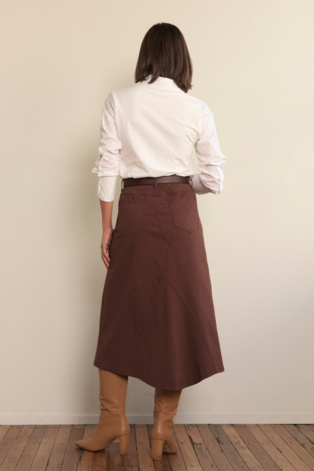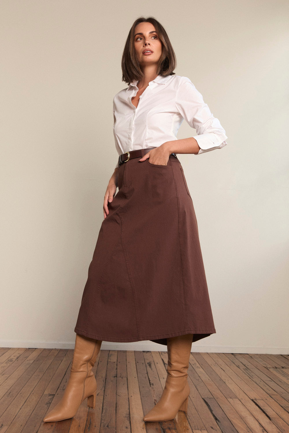 Effortless and versatile, the Stretch A-line Skirt in Chocolate is a modern wardrobe essential. Featuring a flattering gusset hem, button zip closure, and practical pockets, it’s your go-to for timeless everyday style.