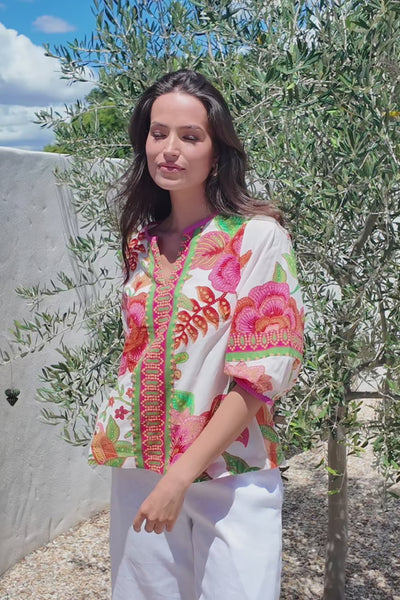 Light and effortless, the Amia Top is the essence of relaxed summer style. With its soft v-notch neckline, gently gathered ¾ sleeves, and easy drape, it offers everyday comfort with refined simplicity. The bright pink and green floral print adds a lively burst of colour, perfect for sunlit days and easy dressing.