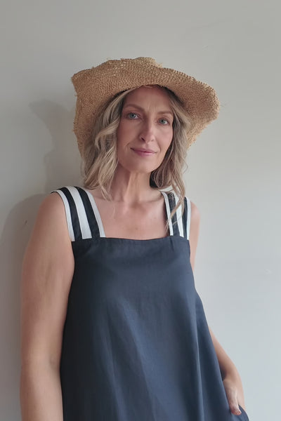The Adrift Bec Linen Sundress is effortless summer elegance at its finest. This maxi-length dress is designed for warm days, featuring flat shoulder straps accented with delicate white stitching and trim for a refined contrast.