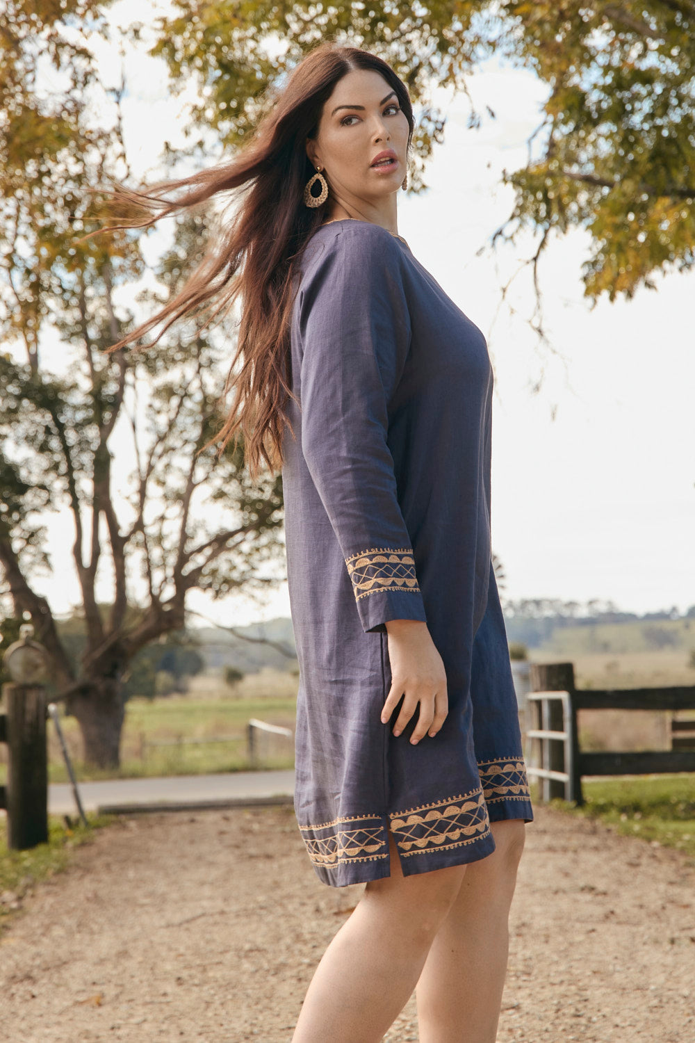 The “slate” colour is very different & has a tinge of blue/purple to it. The linen fabric is beautiful with some weight to it, making it the perfect trans-seasonal dress. Wore it at the end of the Brisbane winter as well as in the Melbourne spring, both with very minimal creasing.