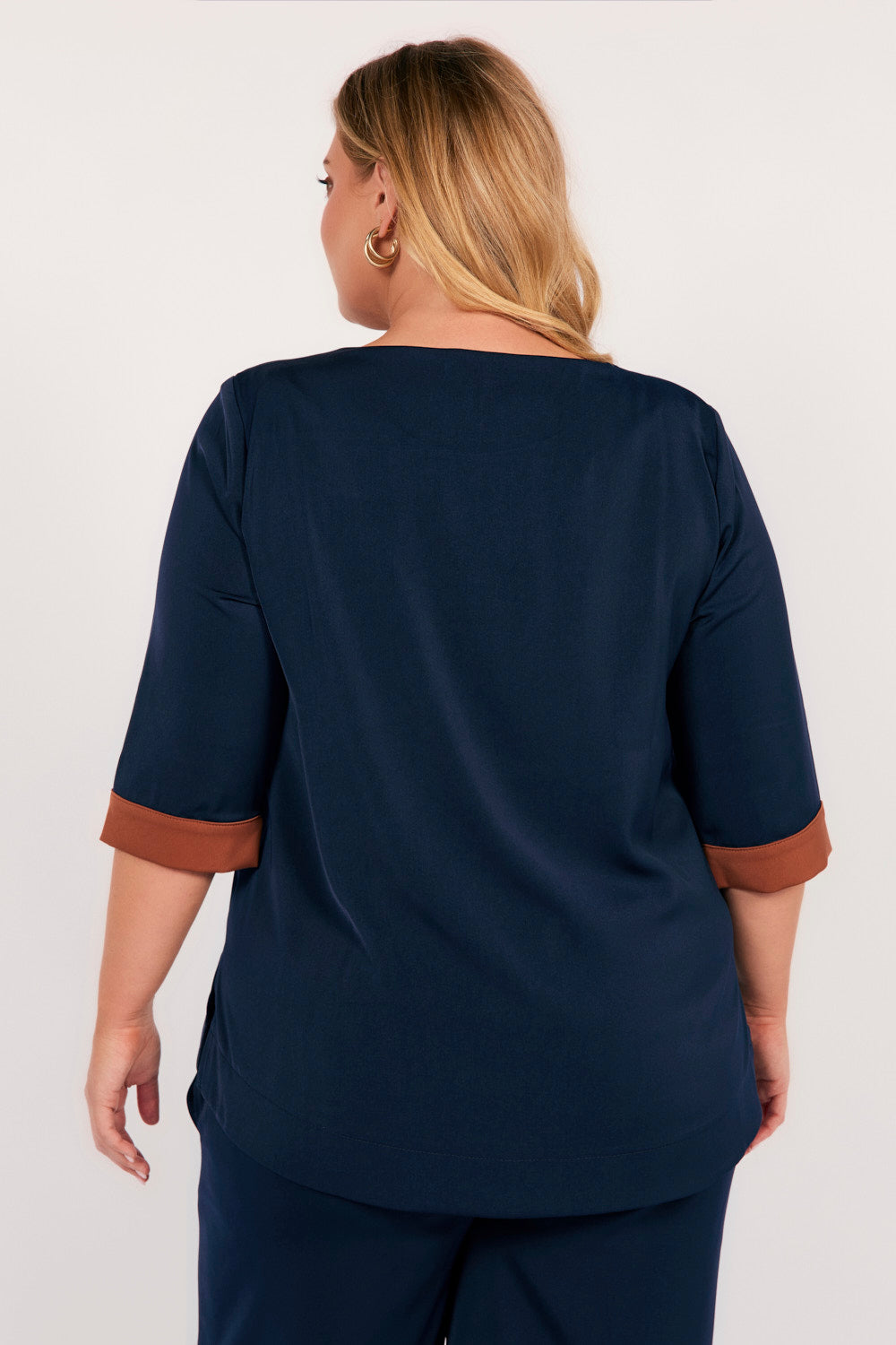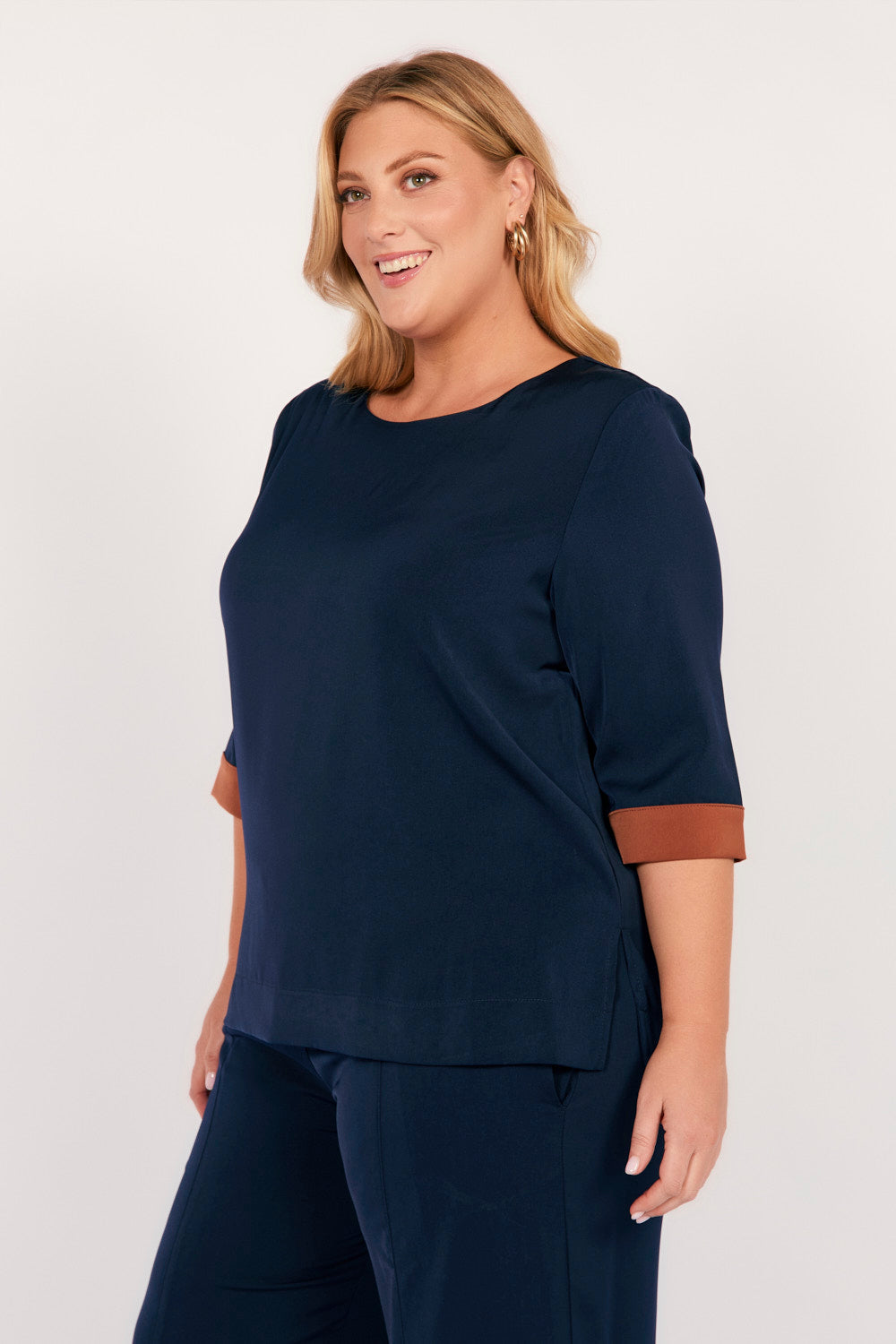 Crafted from a soft, smooth fabric blend, the Boatneck Top features elegant ¾ sleeves with contrast cuffs, and a high-low hem with side splits. Its deep navy tone and easy fit make it a versatile staple for modern Australian wardrobes.