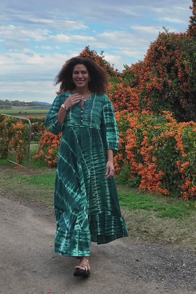 Light and natural, the Bonnie Umbrella Dress in Shibori Green combines boho elegance with everyday ease. Featuring a buttoned V-neckline, billow sleeves, and a breezy cotton silhouette, it’s finished with thoughtful details like a hem frill, waist tie, and pockets.