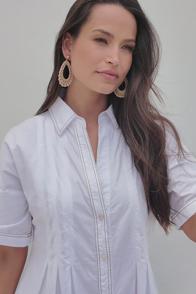 The Bridget Pleated Dress in Vela is all about effortless sophistication. Made from crisp white cotton, it drapes beautifully with soft pleats that fall from shoulder to waist. The collared v-neckline, rolled sleeves and pockets give it that easy, everyday feel; perfect for warm days, workdays, or weekend strolls.