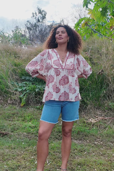 Embrace effortless boho charm with the Cairo Boho Blouse in Moroccan Belle Coral, featuring a plunge v-neckline, ¾ sleeves with elasticated cuffs, and contrast piping detail. Designed with 100% lightweight cotton, it’s soft, breathable, and perfect for warm-weather days.