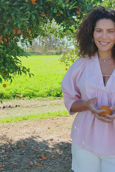 The timeless Cairo Boho Blouse in Primrose Pink offers a relaxed fit, plunge v-neckline, and ¾ sleeves with subtle elastic cuffs. Designed in Brisbane from soft, breathable cotton, it’s a conscious choice for effortless Australian summer style.