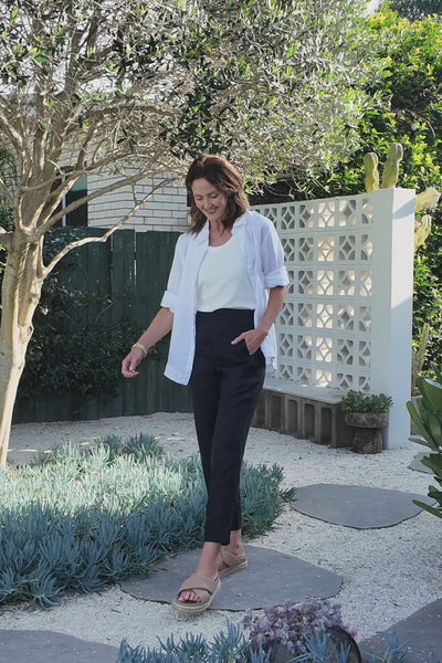 Crisp and contemporary, the Caprice Linen Pant in Black features a relaxed straight-leg fit, high waist, flat front waistband, and elastic back. Designed in Brisbane, the wide hem with optional cuff adds versatile, modern elegance.