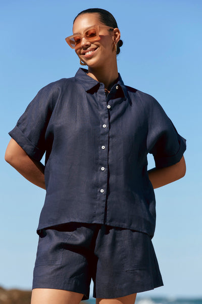 Introducing the Carmen Linen Shirt by Adrift – where timeless sophistication meets laid-back charm. Crafted entirely from 100% linen, this collared top with short rolled sleeves embodies cool elegance.