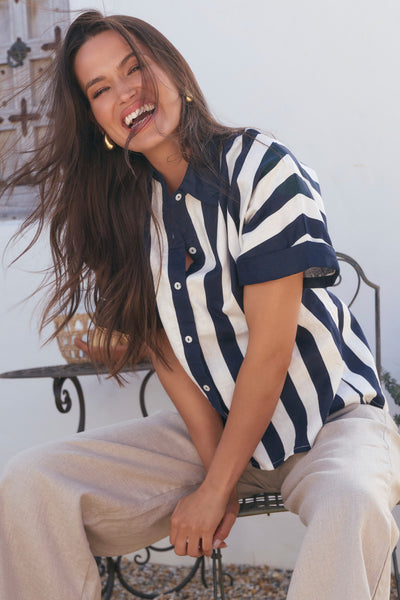 Back by popular demand, the Carmen Shirt in Voyager returns after being one of our most loved prints. Crafted from a soft Linen Cotton blend, it features a relaxed shape, short cuffed sleeves, and a classic collared neckline. The bold navy and cream stripes make this timeless piece perfect to pair back with the matching Breezy Pants or your favourite linen staples.