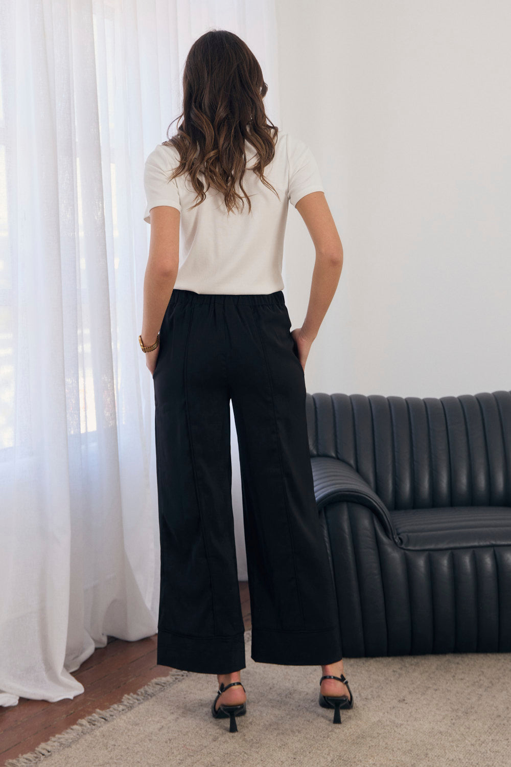 Relaxed yet polished, the Cleo Wide Leg Pant in Black was designed with thoughtful details—piping along the front and back seams, and flowing fabric that moves effortlessly. Side pockets and a wide hem finish the look with laid-back elegance.
