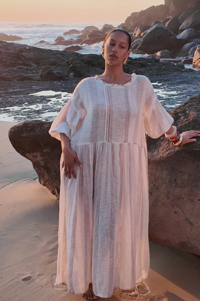 Designed in Brisbane, the 100% cotton Coco Billow Dress in Natural Stripe blends luxe resort wear with everyday ease. Reversible in design with shell buttons, billow sleeves, and a relaxed stripe weave, it’s the ultimate Australian summer dress for coastal living.