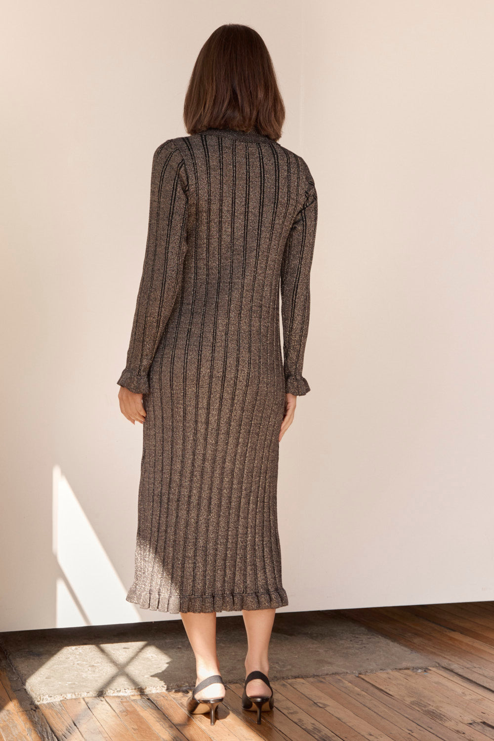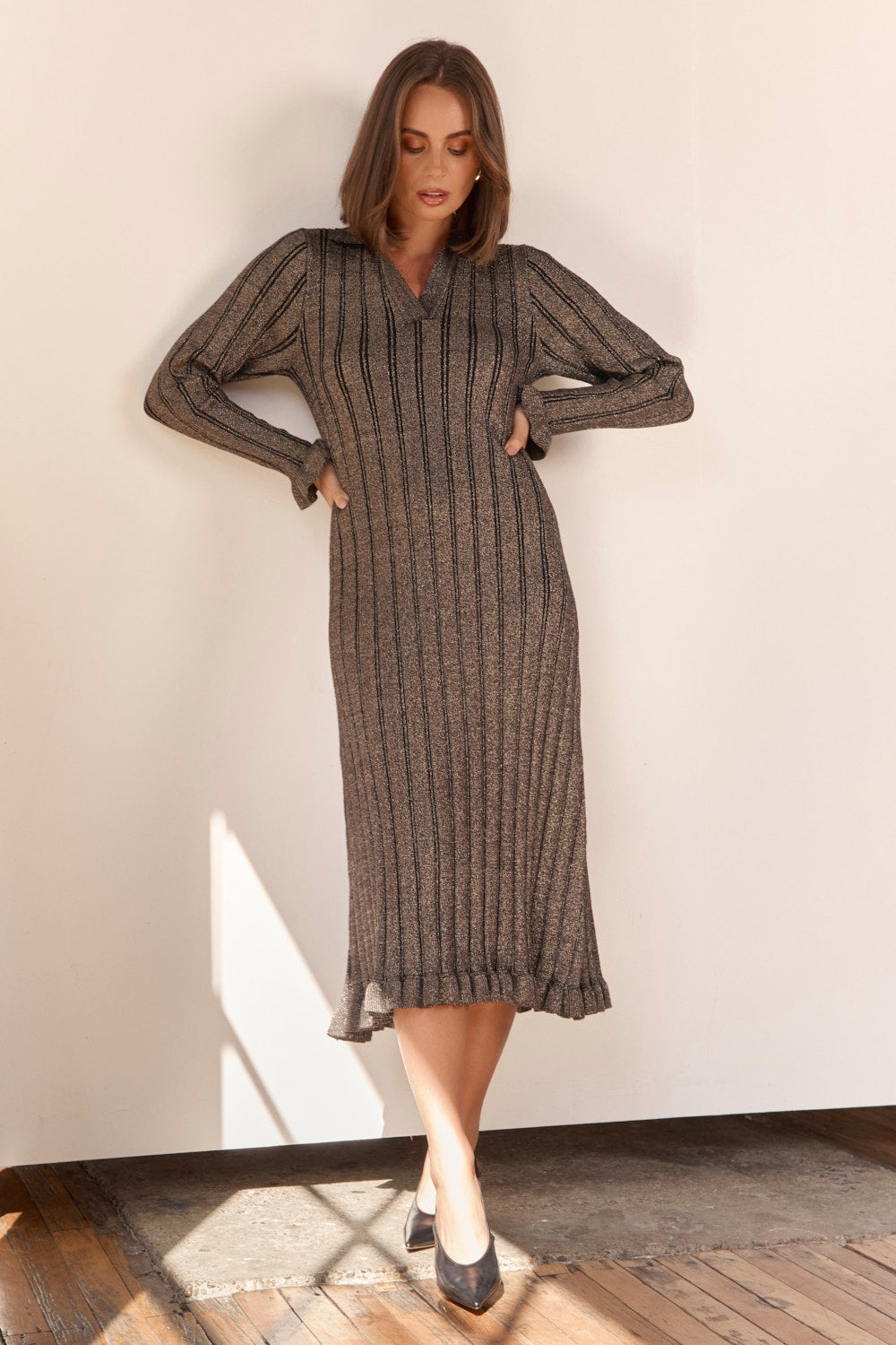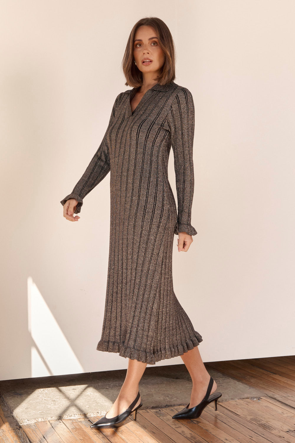 The Collared Knitted Swing Dress exudes effortless glamour, featuring a chic collared V-neckline and shimmering gold metallic ribbed knit. With long sleeves and feminine frill cuffs, it’s the perfect blend of modern polish and luxe texture.