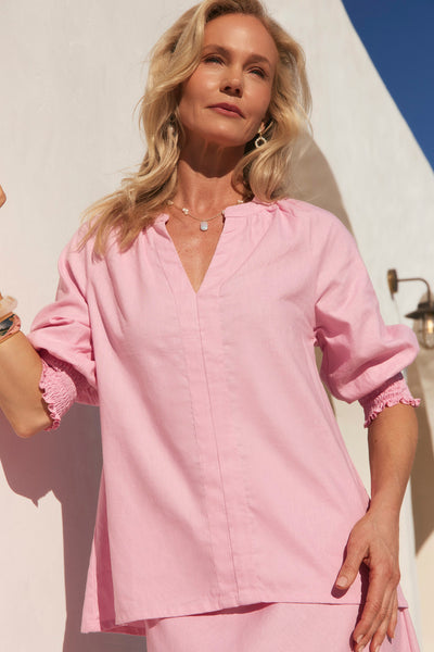 The Danny V-Neck Blouse in Peony blends breathable linen and cotton for lightweight, durable wear. Designed with an A-line fit, gathered neckline, and shirred cuffs, it offers minimalist style with conscious comfort.