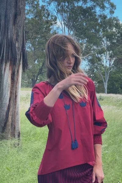 The Danny V-Neck Top in Inkwell Burgundy brings bold embroidery to a relaxed, everyday shape. Cut in 100% cotton with billowy sleeves and a soft V neckline, it’s a standout top that pairs beautifully with denim or linen.