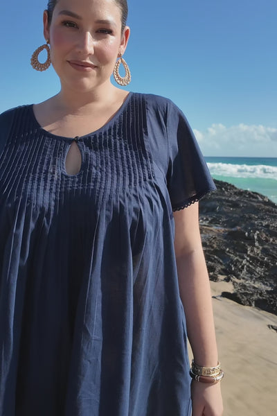 The Elsa Dress feels calm and considered in the Tidepool print, with soft blue tones that are easy to wear day to day. Crafted from breathable 100% cotton with a relaxed silhouette and gentle detailing through the bodice, it’s finished with an Adrift-exclusive print, thoughtfully produced in limited runs.