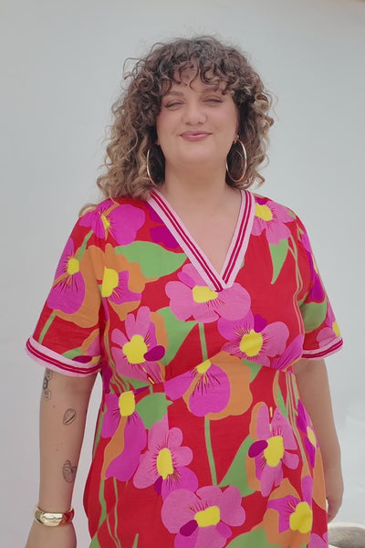 The Farrah Dress in Flamenco brings a burst of colour to summer. Made from 100% cotton, it features an empire line for a flattering fit and a lively floral print in pink, red, and yellow. A classic Adrift shape in a joyful new print.