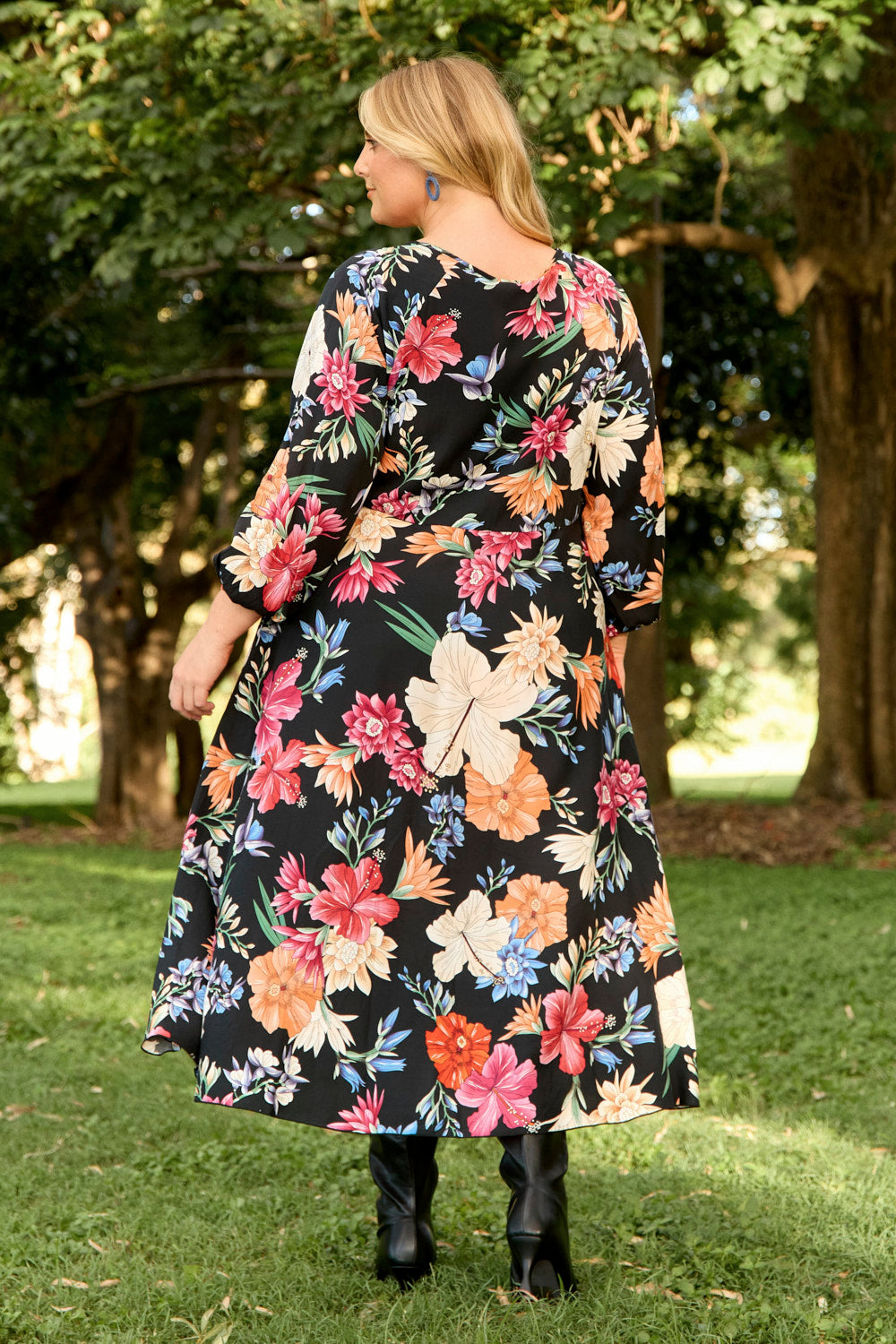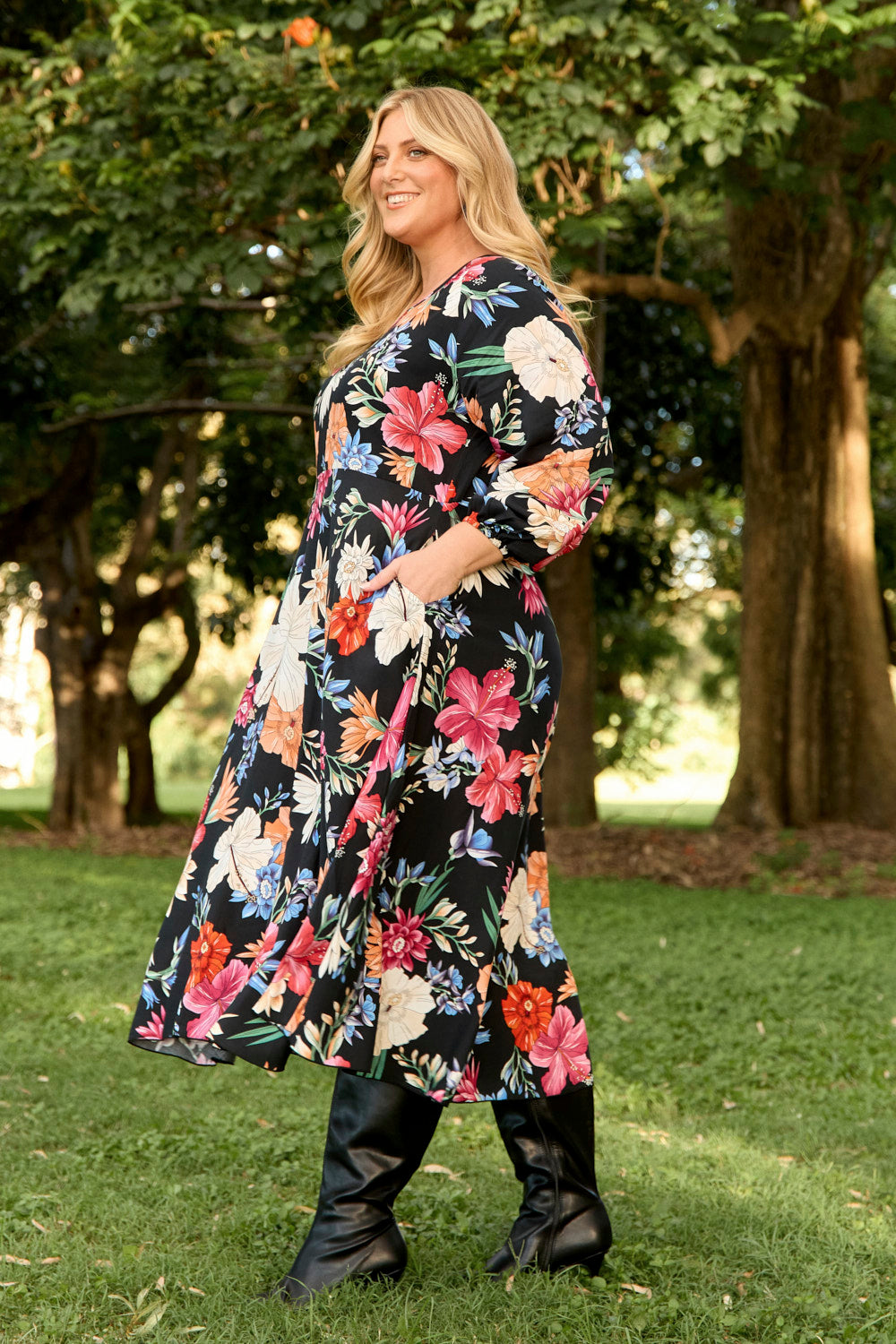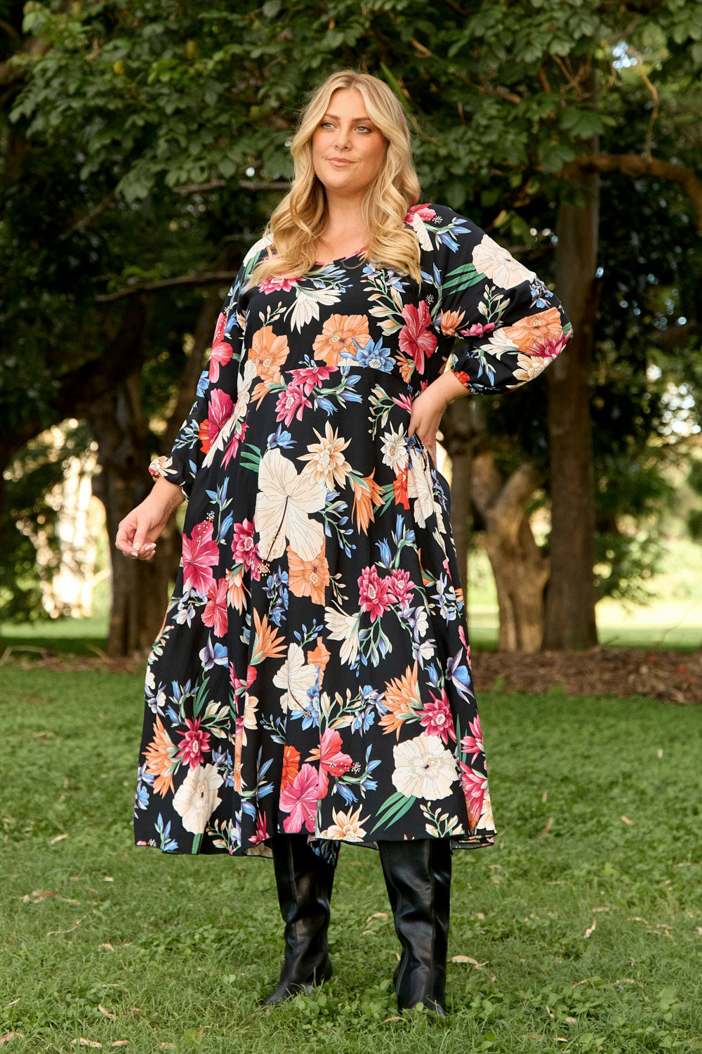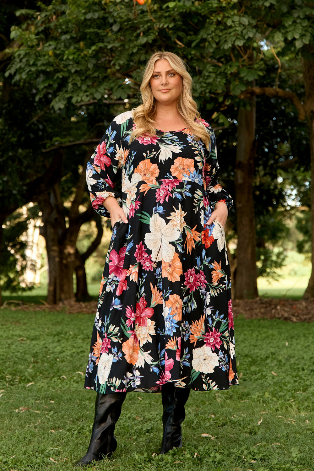The Felisha Bias Cut Dress features a soft scoop neckline, flared skirt, and long raglan sleeves. Designed with breathable rayon, it brings together modern ease and timeless Australian elegance—pockets included.