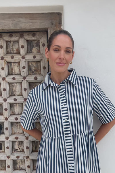 The Ginette Short Dress in Navy Stripe brings a relaxed shirt silhouette with a soft tiered shape. Crafted in 100% cotton, this is an easy warm-weather style that feels light, fresh and ready for everyday wear.