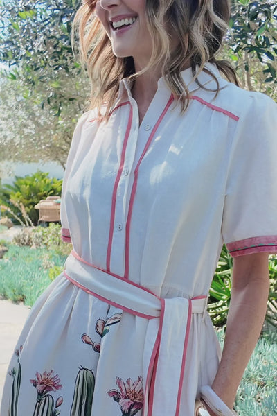 The Ginette Dress brings a timeless elegance to everyday dressing. With its collared neckline, defined waist, and softly gathered skirt, this linen-cotton style blends structure with ease. Detailed with contrast piping, pockets, and a self-tie belt, the vibrant cactus border print adds a unique touch of warmth and artistry to this summer standout.