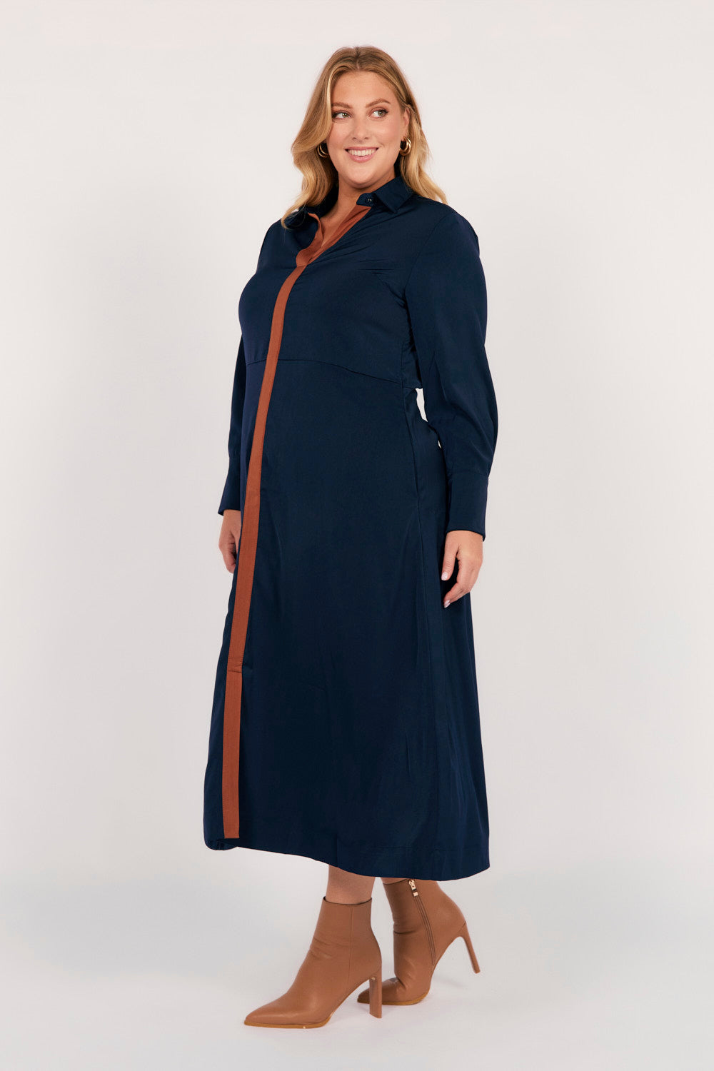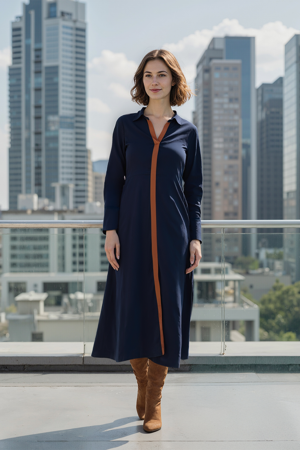 Crafted in a deep navy tone, the Grace Dress brings effortless elegance with a tailored two-piece collar and waist-defining seam. Soft, smooth, and functional, it’s finished with long sleeves, side pockets, and a subtle front hem split.