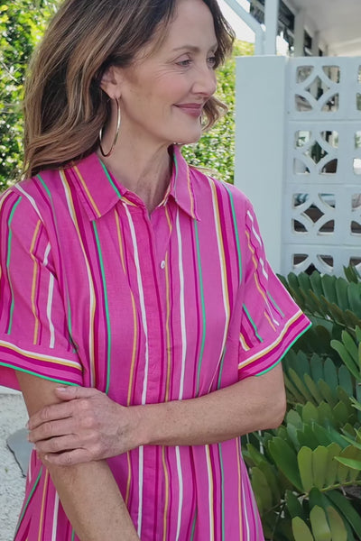 Brighten your wardrobe with the Gracie Shirt Dress in Melonie, blending relaxed short sleeves, a classic collar, and front button detailing with a modern, minimalist silhouette. Crafted from a breathable linen-cotton blend, it’s stylish, practical, and built for all-day comfort.