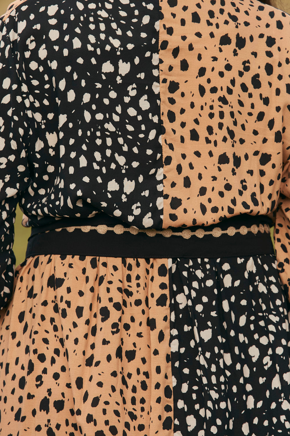 Float through the seasons in the Gracie Tie Dress in Bold Harmony, where delicate embroidery meets breezy rayon in alternating tan and black hues. With its classic collar, and clever bust-button detail, it's a playful nod to timeless style.