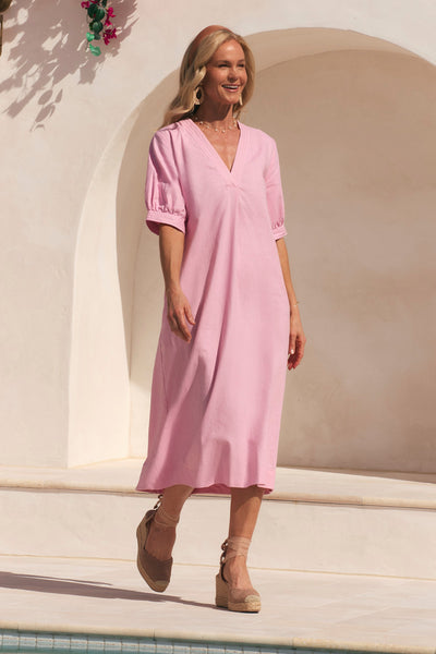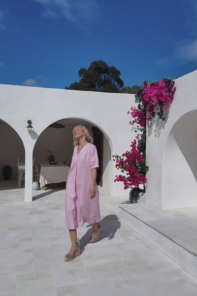 Soft linen and cotton combine in the Kora A-Line Dress in Peony, designed in Brisbane for breathable, natural comfort. With a swing silhouette, puff sleeves, and convenient pockets, it’s a modern essential for all seasons.