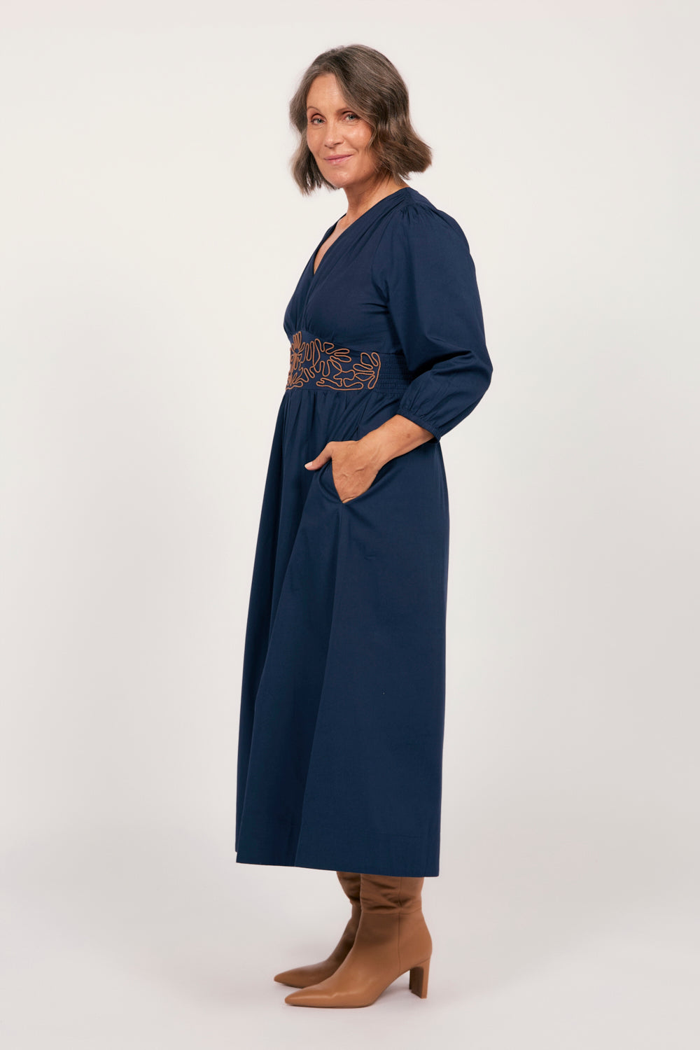 The Lisa Embroidered Dress in Dorie is a timeless wardrobe staple, boasting ¾ sleeves, cord embroidery, and a flattering shirred back. Complete with pockets and elegant detailing, it’s made to move with you.