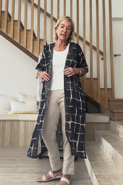 Layer your look with ease in the Liv Linen Duster in Woven Echo, featuring a short batwing sleeve and effortless drape. Designed in Brisbane from 100% breathable linen, it’s the perfect resort-ready piece for summer through to trans-seasonal styling.