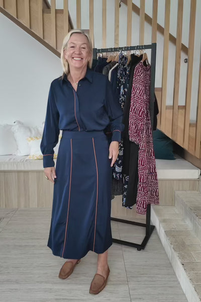 A modern take on classic Australian fashion, the Maddy Skirt features clean panel seams with contrast piping. With a comfortable elasticated back waistband and side pockets, it delivers understated elegance from day to night.