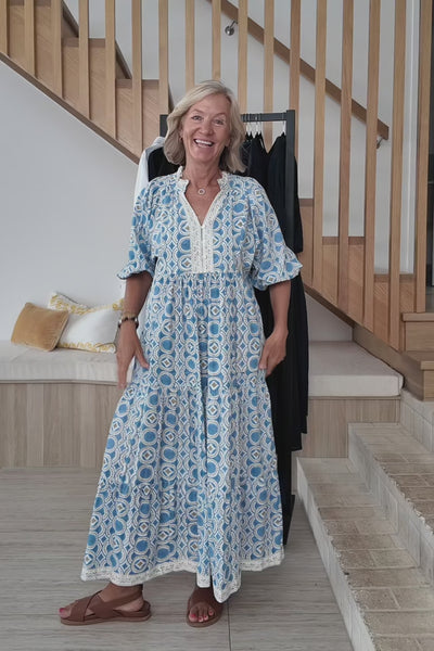 Mirabelle Frill Dress in Elysian feels calm and airy in soft blue floral print, easy to slip into and even easier to love. The tiering and gentle volume bring beautiful movement, perfect for warm days and unhurried moments by the sea.