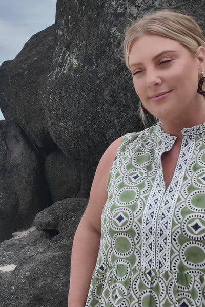 The Rita Frill Dress is an Adrift classic, reimagined in our new hand-printed Evergreen collection. Made from 100% cotton, this sleeveless tiered dress drapes beautifully with a relaxed, airy silhouette and subtle detailing through the neckline.