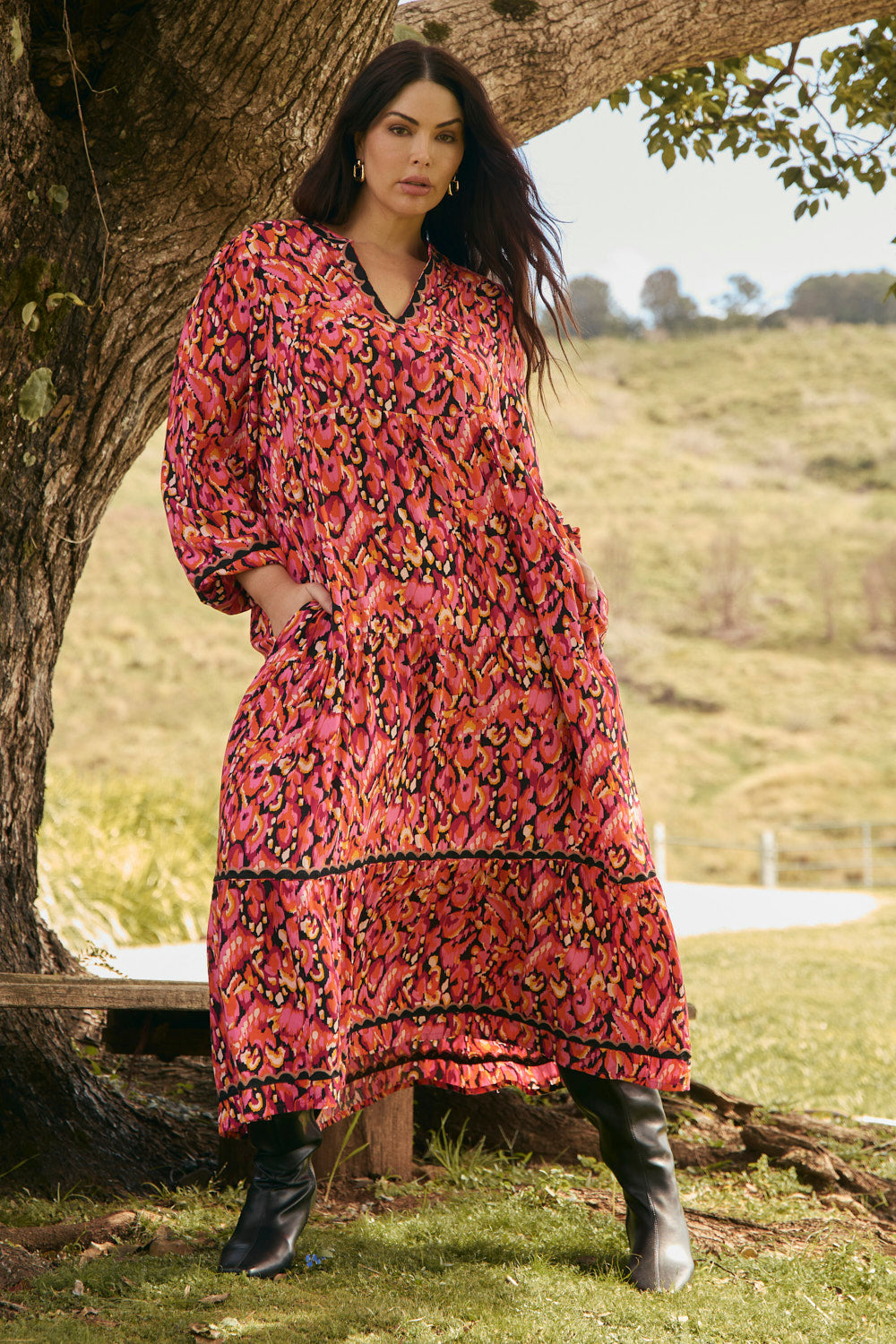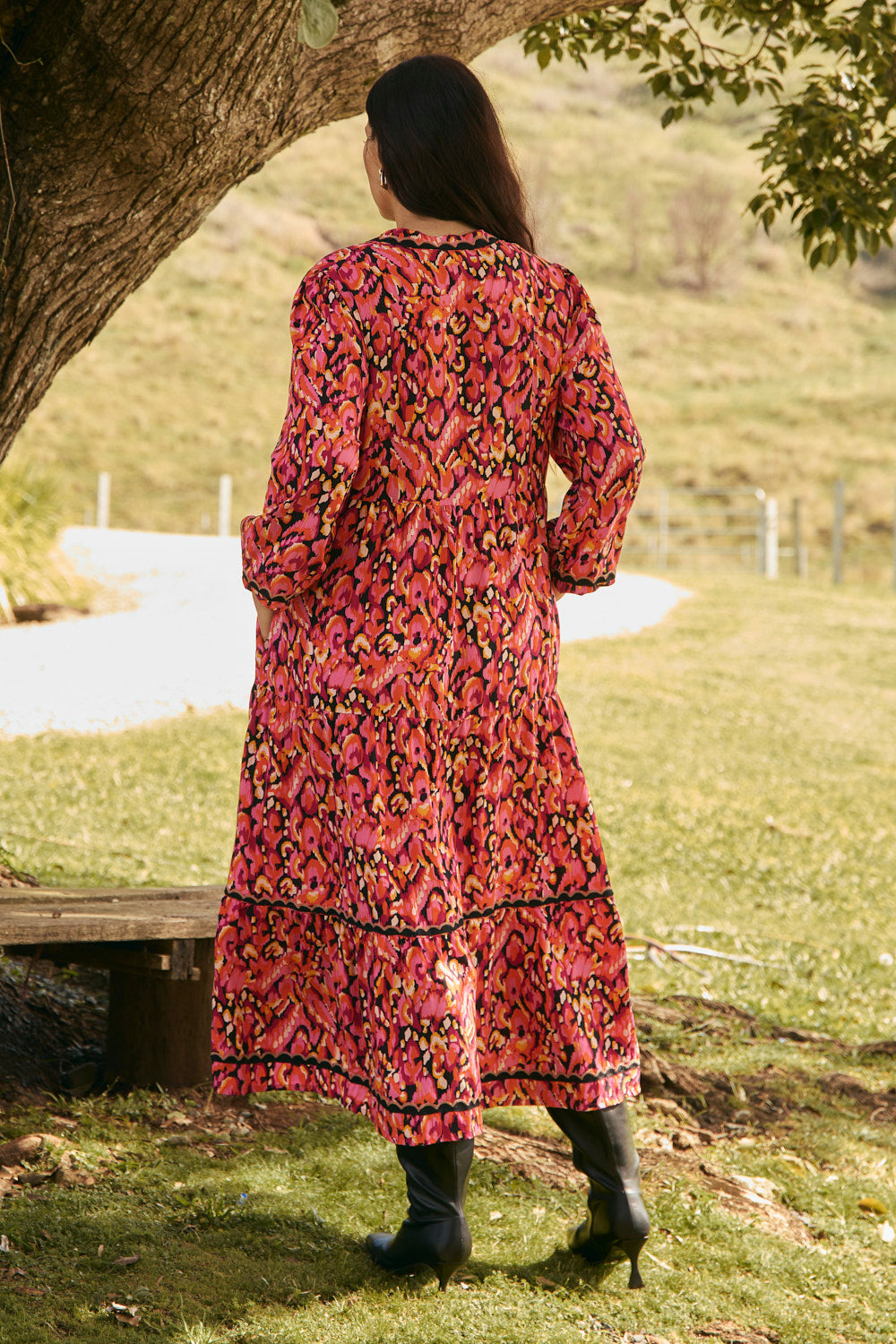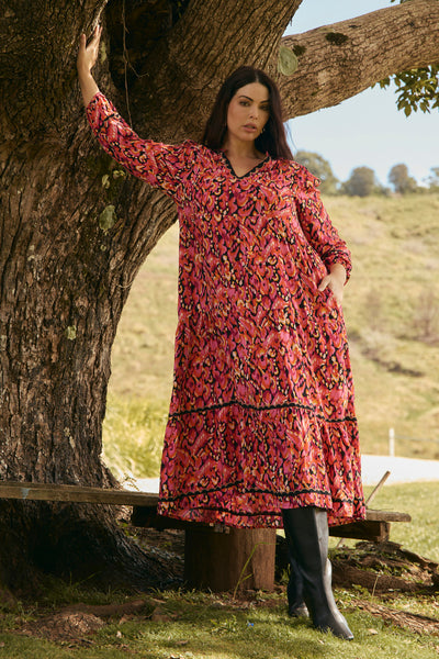 Effortlessly romantic, the Sabre V-Neck Dress in WIld Ember features soft embroidery details, and a flattering v-neck Mandarin collar. Finished in a bold print and a tiered skirt that flows with every step.