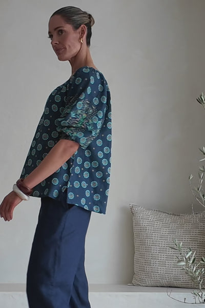 The Sara Blouse bursts with tropical colour, featuring lush palms and coastal botanicals on a bright, aqua base. Light, breathable 100% cotton and softly gathered sleeves make it an easy throw-on for sunshine, holidays and everyday joy.