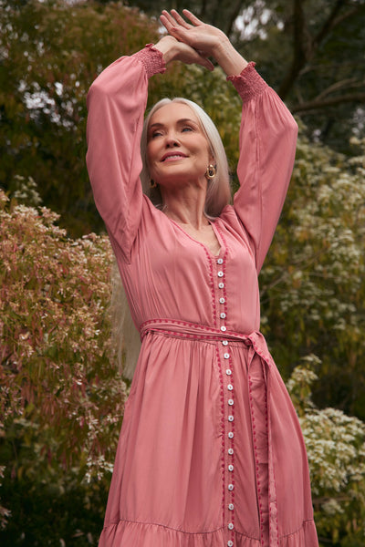 Channel feminine elegance in the Savelle Embroidered Dress in Earth, adorned with contrast embroidery and soft dusty pink tones. With floaty sleeves, an elasticated waist, and a delicate tie belt, it’s your go-to for romantic everyday style.