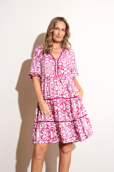 Effortlessly charming, the Scout Billow Sleeve Dress in Mulberry Bijou brings together a flattering V-neckline, elbow-length sleeves, and handy pockets in a fresh mulberry pink print. Designed in Brisbane from premium rayon, it’s your go-to for timeless Australian fashion.