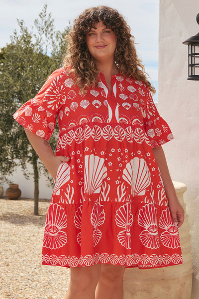 Bright and full of summer spirit, the Scout Tiered Dress in Shelly Print is a standout for sun-filled days. Designed in a vibrant coral hue with playful shell motifs, it features a tiered silhouette, notched neckline, and soft frill sleeves for an easy, relaxed shape. A joyful piece that brings a touch of coastal charm to every occasion.