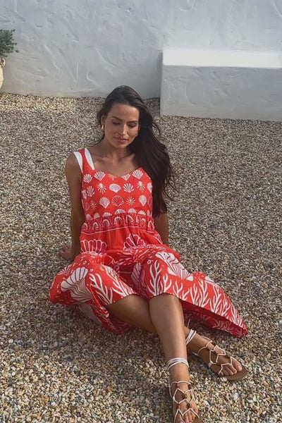 The Solene Sun Dress is made for bright days and easy wear. With its soft empire line, flowing maxi length, and structured cotton poplin, it feels cool, comfortable, and flattering to wear. The bold coral and white Shelley print adds a fresh coastal energy that stands out all season long.