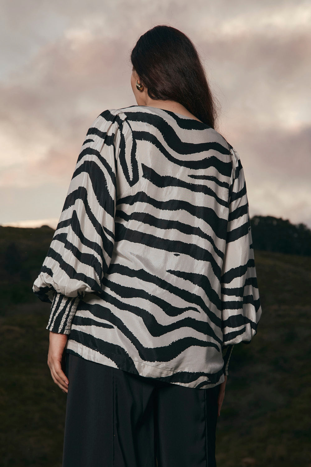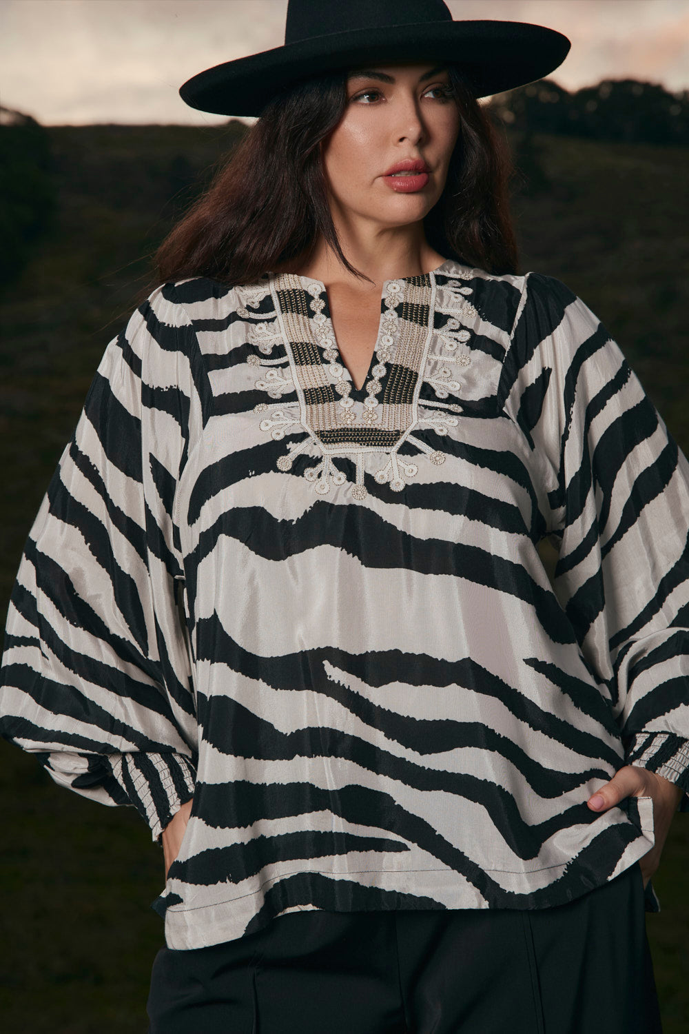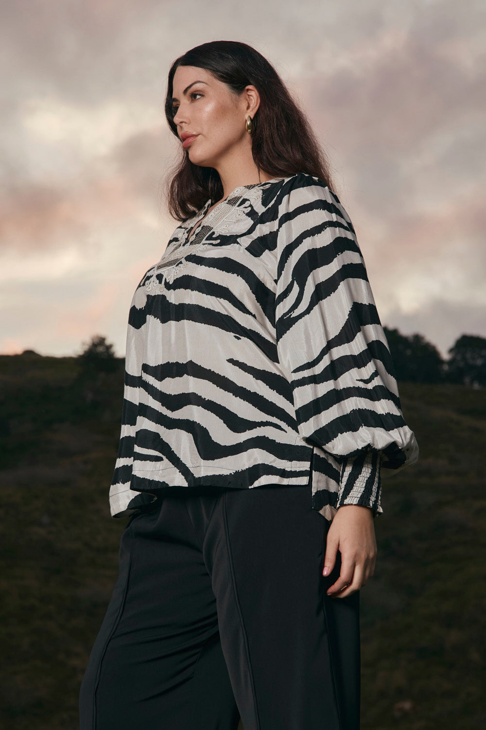 The Sylvie Top in Bengal combines whimsy with modern elegance. Its long billow sleeves, and embroidered neckline are complemented by a high-low hemline and side splits, all in a stunning black-and-white Bengal tiger print.