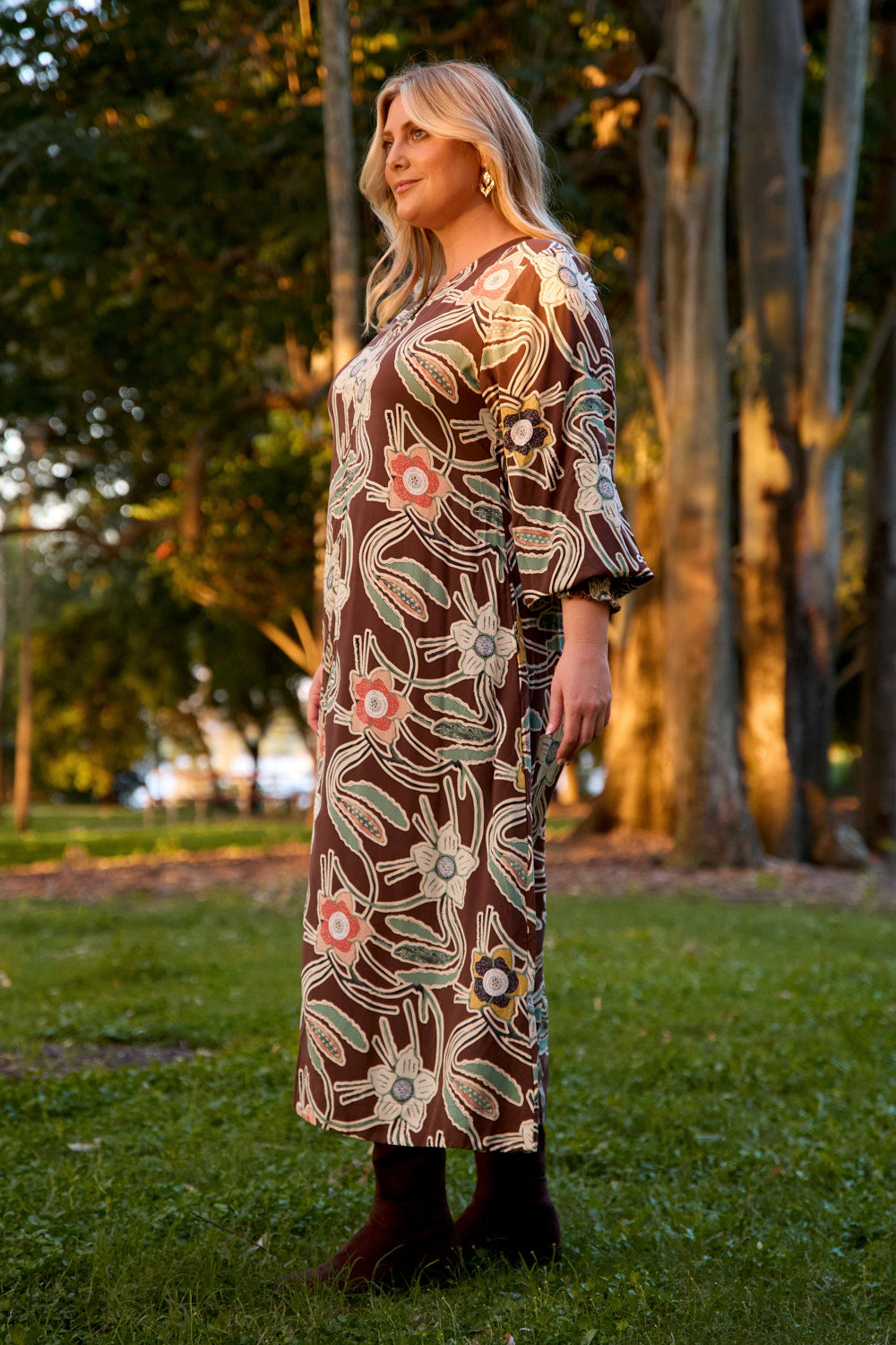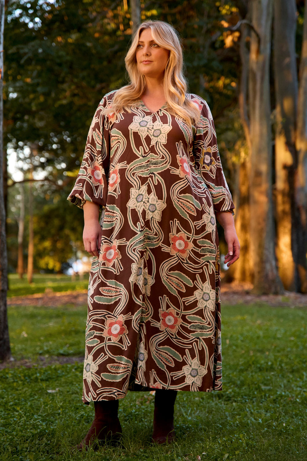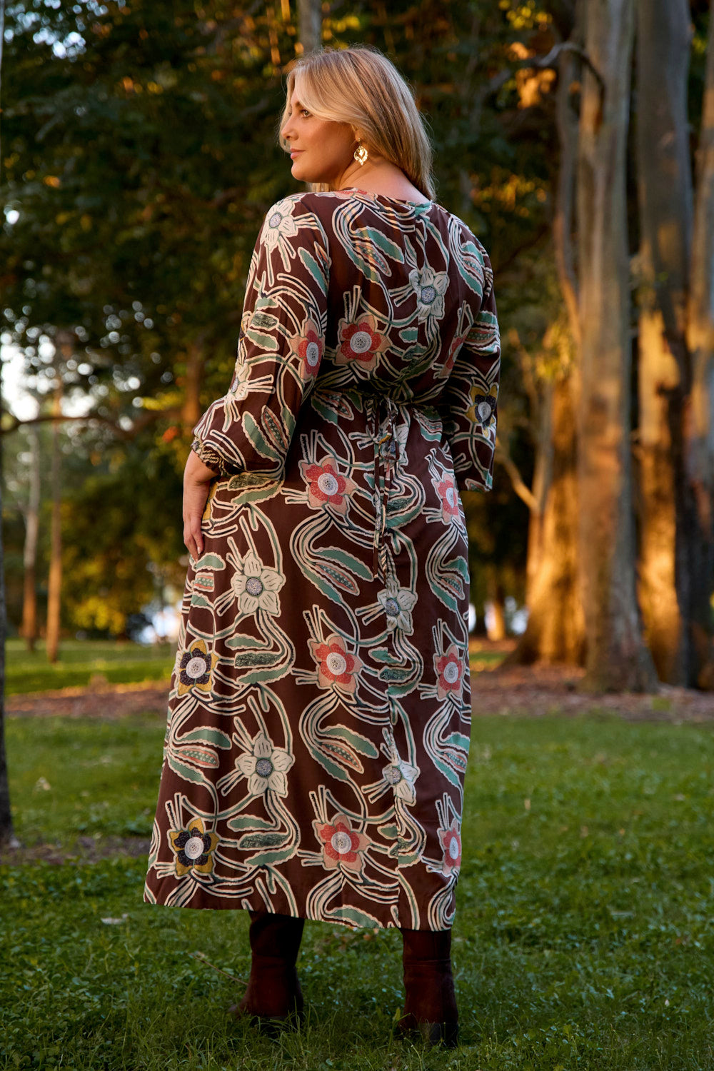 Rooted in natural beauty, the Tamryn Long Sleeve Dress in Twilight Grove features a swing silhouette, soft v-neckline, and billowing long sleeves. Finished with side waist ties and practical pockets.