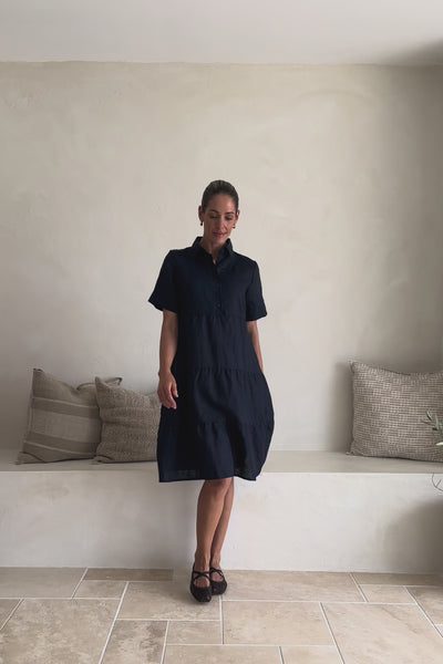 Introducing Winslow in a timeless Navy linen. Easy, everyday dressing with a button-through front and relaxed tiers built for comfort.